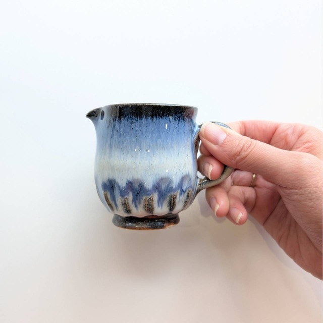 【万風窯の陶器ミルクピッチャー|電子レンジ対応の美しい青】 万風窯らしい、深みのある青が美しい陶器のミルクピッチャー。 蔵王連峰の雪解けを思わせる、やわらかく流れる釉薬の表情が印象的な一品です。 高さ約7cm、口径約6cmと、ミルクを注ぎやすいちょうどよいサイズ感。 コーヒーや紅茶の時間に、さりげなく上質なアクセントを添えてくれます。 万風窯の器は電子レンジ対応のため、ミルクを入れたまま温め、そのままティーカップへ注ぐことも可能。 実用性と美しさを兼ね備えた、毎日のブレイクタイムに頼もしい存在です。 普段使いはもちろん、ちょっとした来客時にも自信をもってお出しできる、凛とした佇まいのミルクピッチャーです。 こちらは万風窯・二代目真美子氏による作品のため、底部分には真美子氏の裏印が入っております。 【万風窯について】 宮城蔵王・遠刈田温泉にあります陶芸工房。 築窯35年以上の歴史をもち、現在親子二代で作品を作り続けています。 口当たりや手触りにまで心を配った器は、食卓に並べるだけで料理を優しく引き立て、特別な時間を演出。 伝統に根ざしながらも新しい感性を取り入れる万風窯の器は、長く愛用できる生活の道具として、また贈り物としてもおすすめです。 【素材・サイズ】 蔵王土、自家製藁灰釉 サイズ 高さ 約7cm/口径約6cm □電子レンジ使用可○ □食洗機使用可○ □オーブン使用不可× 【ご購入前に】 ・お届けする商品は画像と同じデザインですが、全くの同一ではないため個体ごとに風合いやサイズに若干の違いがあります。 ・光のあたり具合で実物と画像との色味に若干の差がある場合がございます。 ・貫入(表面に入る模様のようなヒビ)、ピンホール(小さな穴)、鉄粉(鉄分が焼かれることによって酸化し黒点となった状態)、釉薬のムラなどの個体差をうつわの個性、うつわの表情として、ご理解をお願い致します。 ・商品に欠陥がある場合を除き、イメージと異なるなどのお客様のご都合による返品や返金は対応しておりません。 ・上記以外の欠陥があった際、商品到着5日以内にお問い合わせフォームよりご連絡をお願い致します。 ・商品到着5日を過ぎてからの返品や返金の対応は致しかねます。 ・返品時の当店による検品にて、使用感や、汚れが見られます際はご返金の対応を致しかねます。 ・当店は店頭販売と在庫を共有しております。 ご注文のタイミングによっては、実店舗での販売により商品が品切れとなる場合がございます。 その際は誠に勝手ながらご注文をキャンセルさせていただく場合がございますので、あらかじめご了承くださいますようお願いいたします。 【配送について】 佐川急便にて発送いたします。