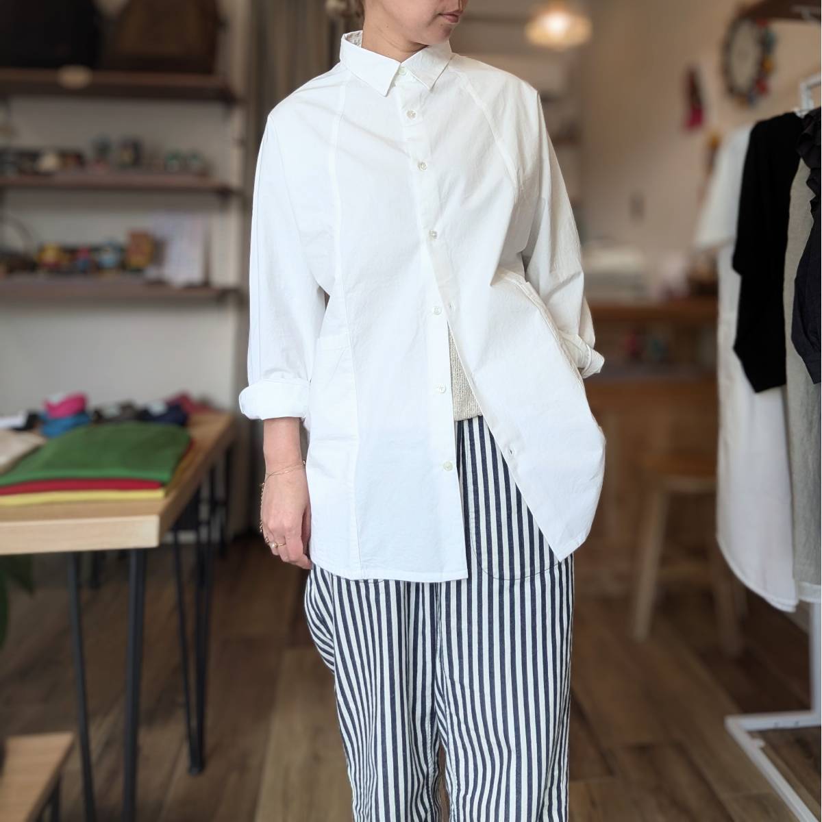 小さめの襟に、肩がなく首から袖にかけて生地がつながったラグランスリーブ仕様のシャツです。