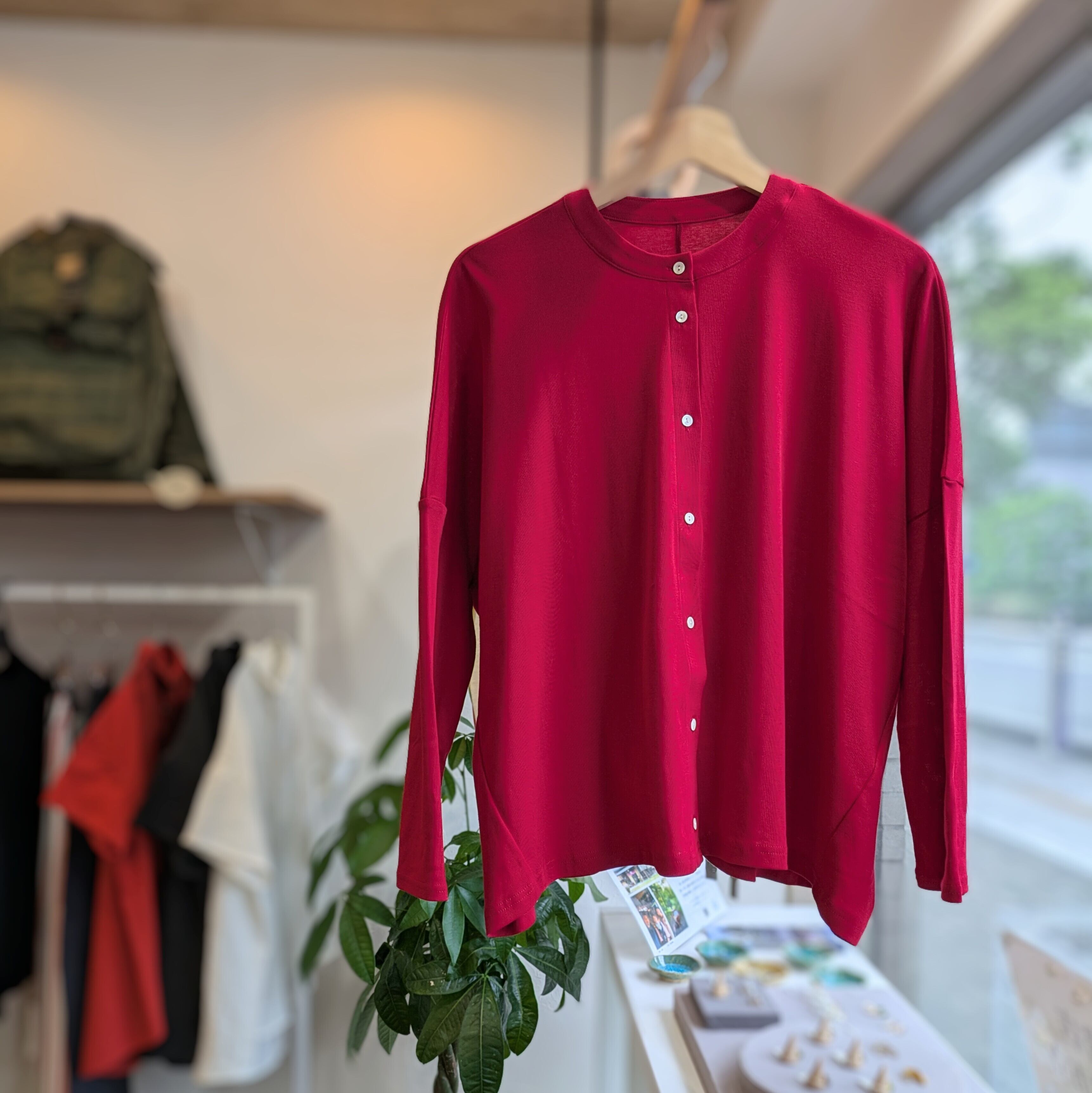 スッキリとしたクルーネックの首元に、ボダンダウンのゆったりとしたシルエット。