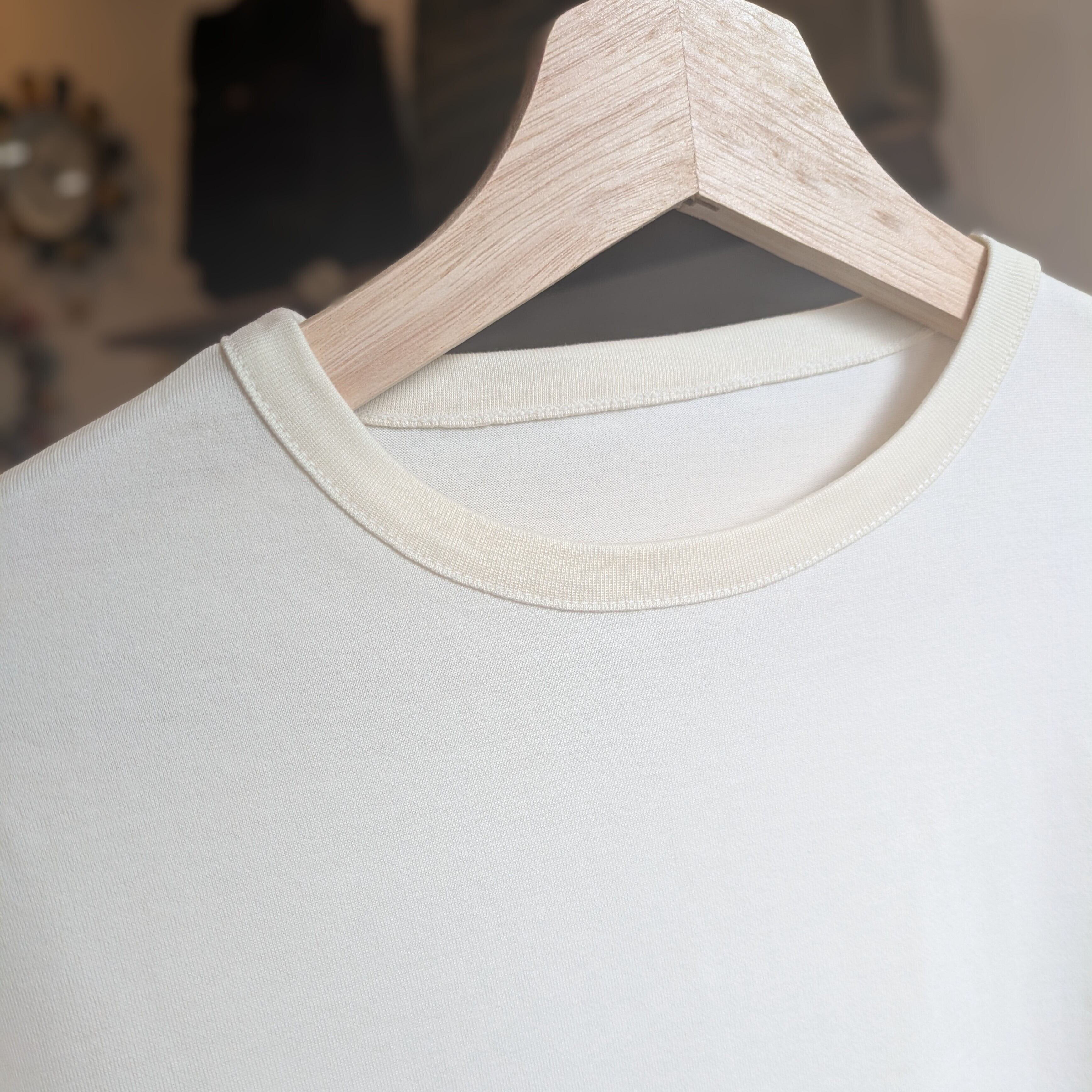 ナチュラルな印象の糸本来の色であるキナリを採用し、普通のロングTシャツとは異なりTシャツ1枚でも上品に着ていただけるよう、生地にシルケット加工を施しています。
