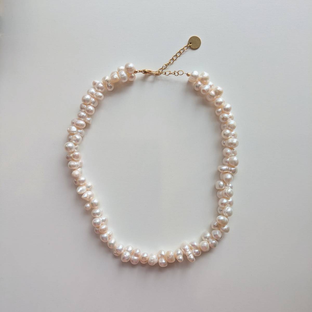 フランスにあるアトリエでハンドメイドで作られ、パール一つ一つに個体差があり、大量生産では生み出されない温か味が感じられる、存在感あるネックレスとなっています。