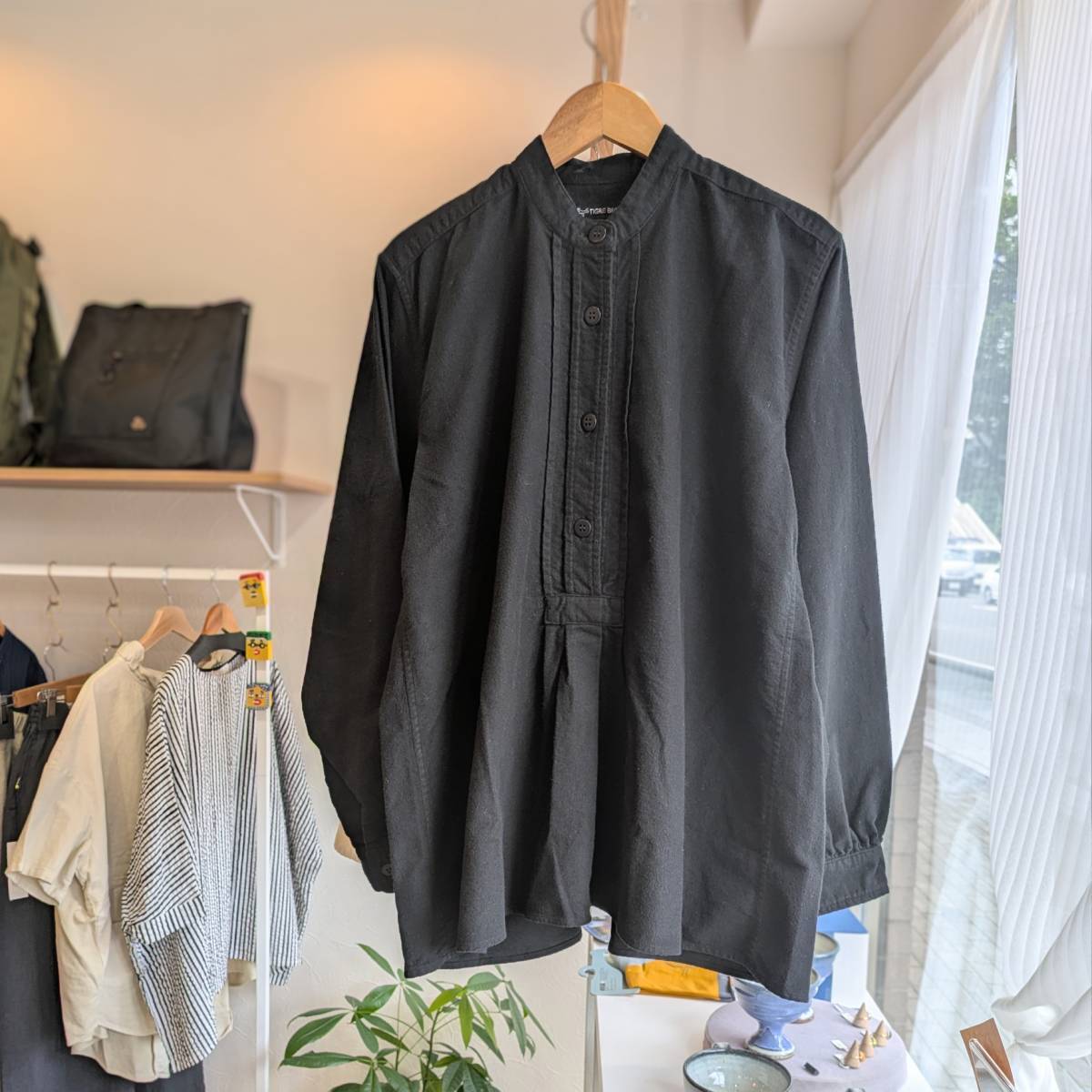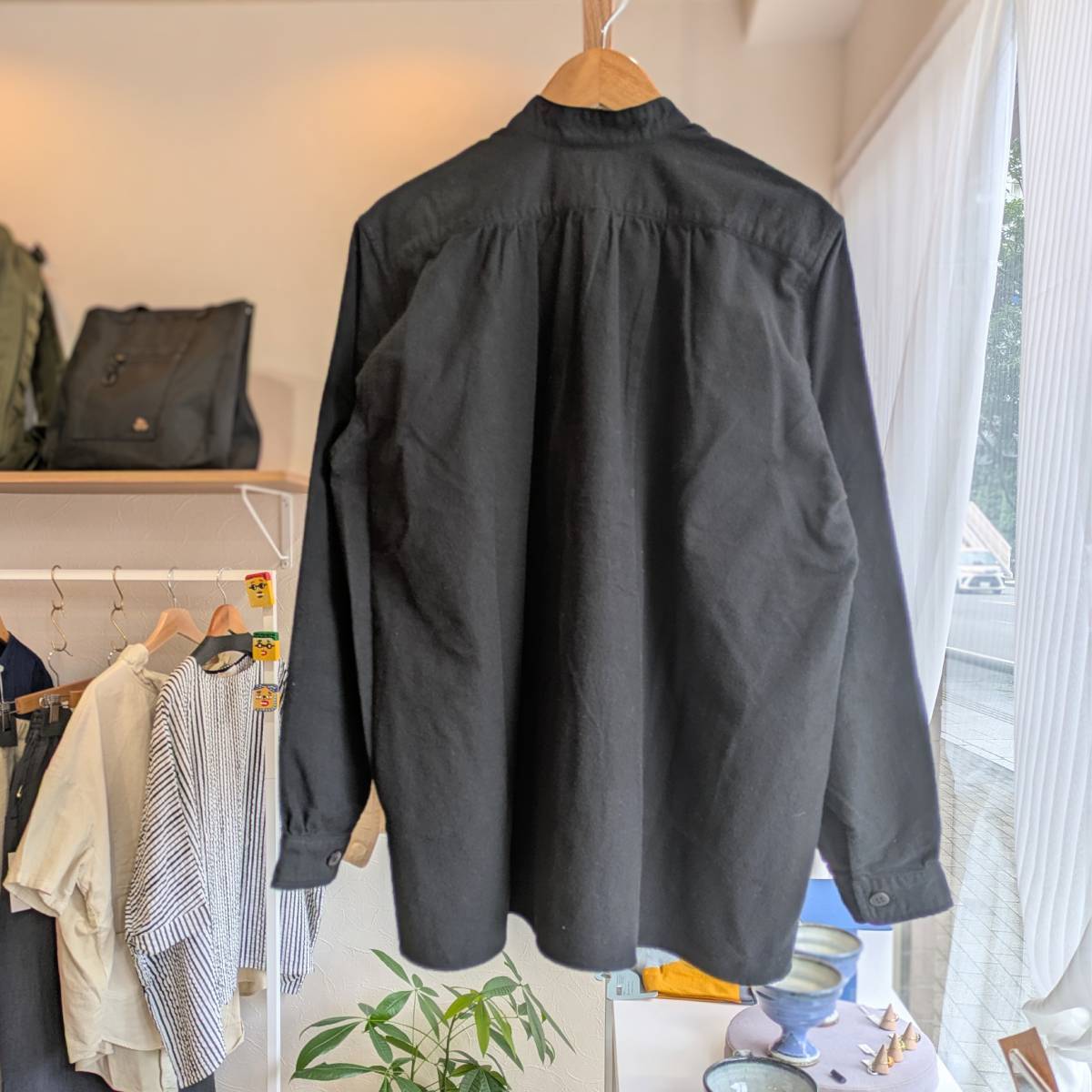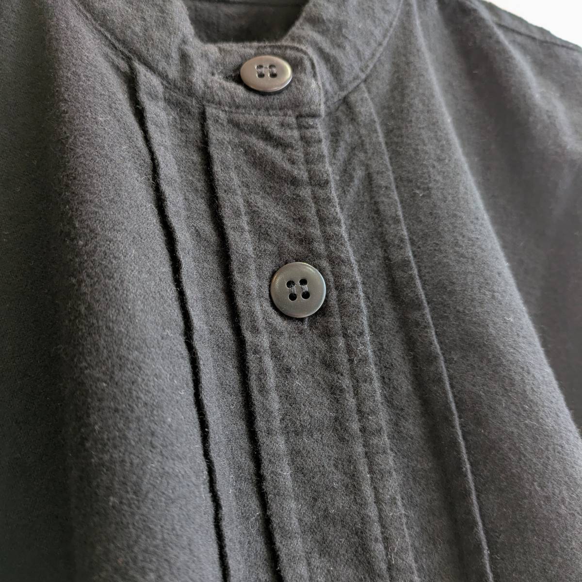 すっきりとした印象のスタンドカラーに、ボタン周辺の前たてのデザインが特徴的で、上品な印象を与えます。