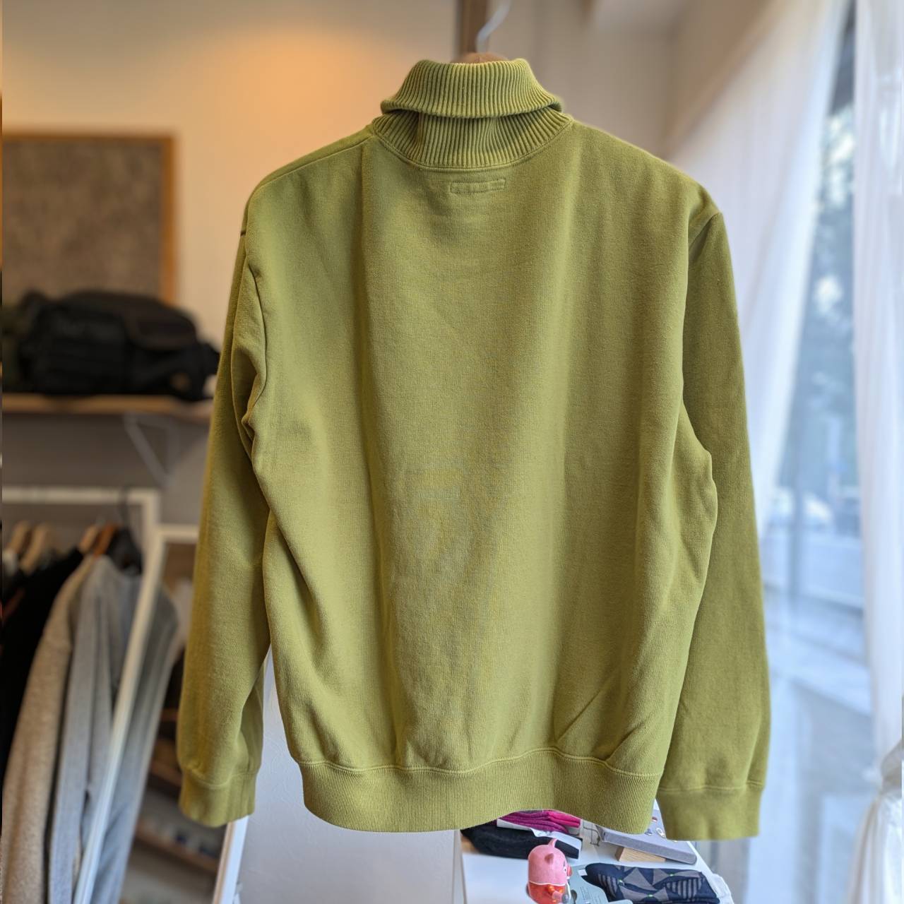 肌触りの良いふんわりスウェット地に、伸縮性のあるリブのタートルネックと、フロントにパッチポケットがついた遊び心のあるスウェット。