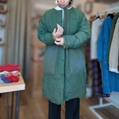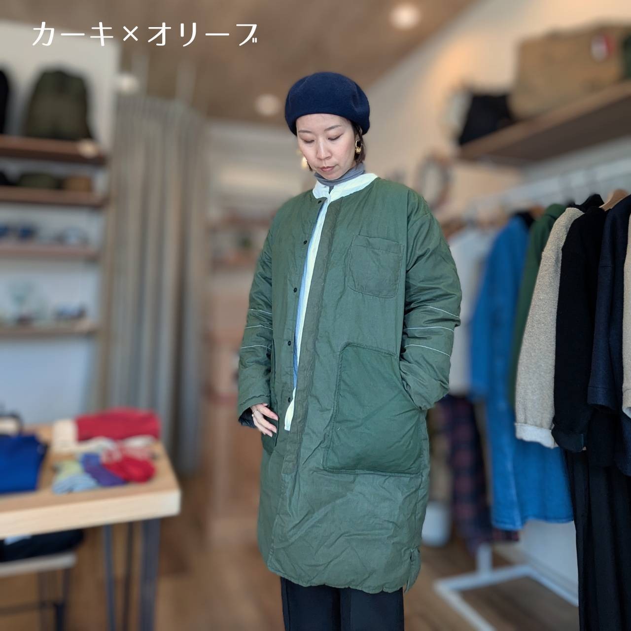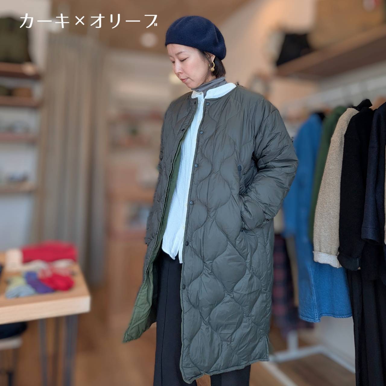 アーミーテントをリメイクしたカーキ色と、オニオン型ステッチを施した高密度ナイロンの光沢が目を引くリバーシブルタイプのダウン。