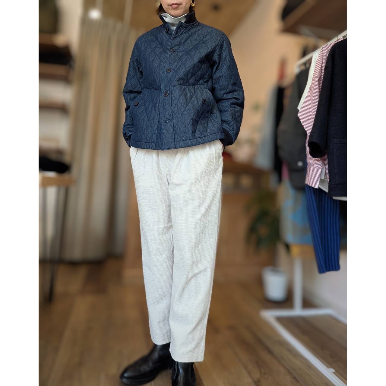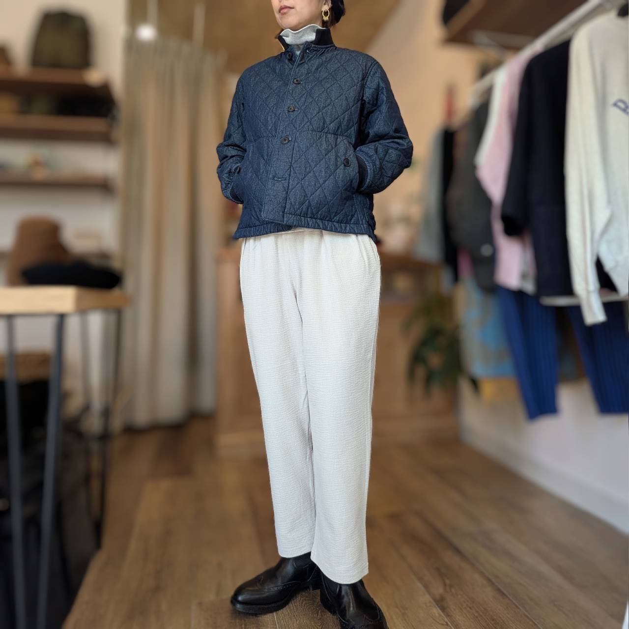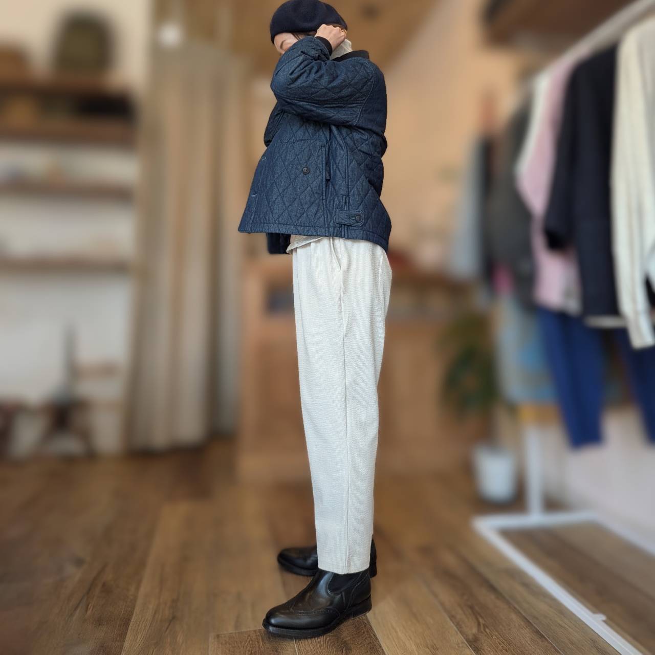裾にかけて細くなるすっきりとしたシルエットで、カジュアルになりすぎず大人らしく着こなせます。