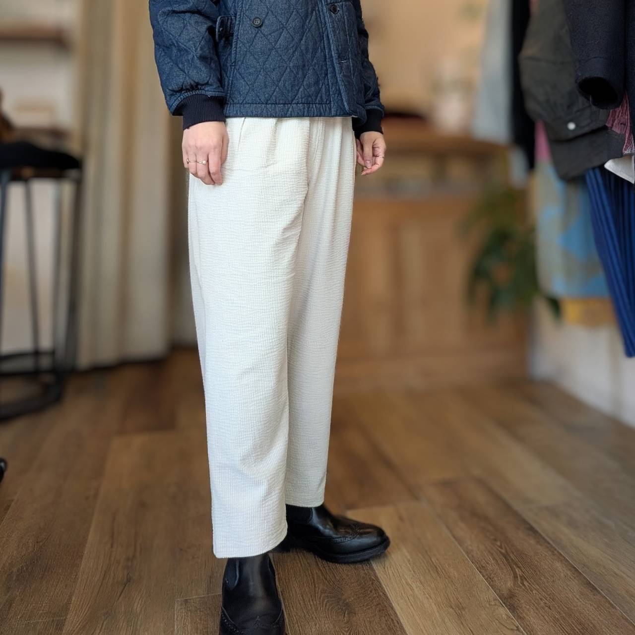 細畝(ほそうね)のコーデュロイ素材を使用した、きれいめな印象のテーパードパンツ。
