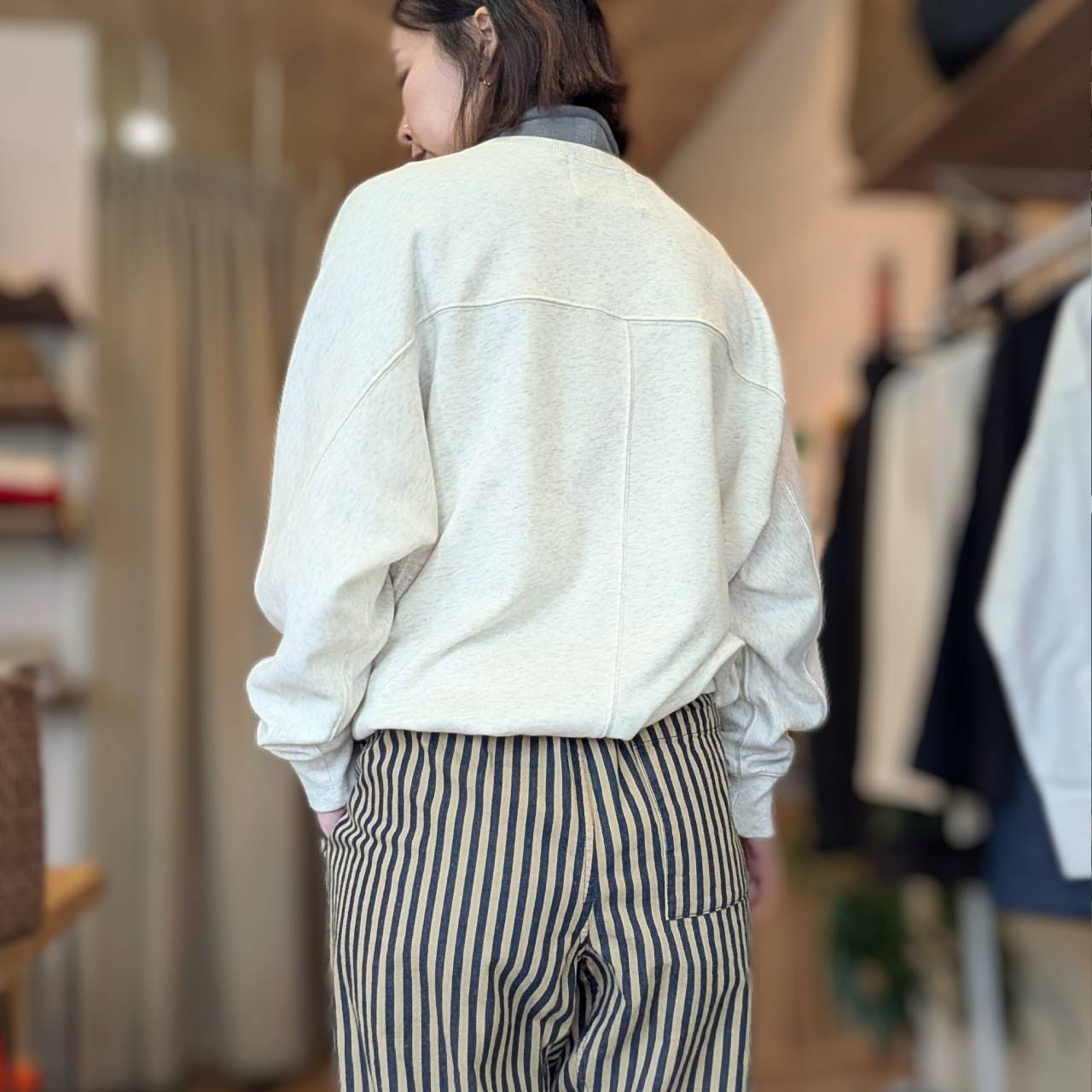 パンツにもスカートにも合わせやすく、きれいめにもカジュアルにも使える万能なトレーナーです。
