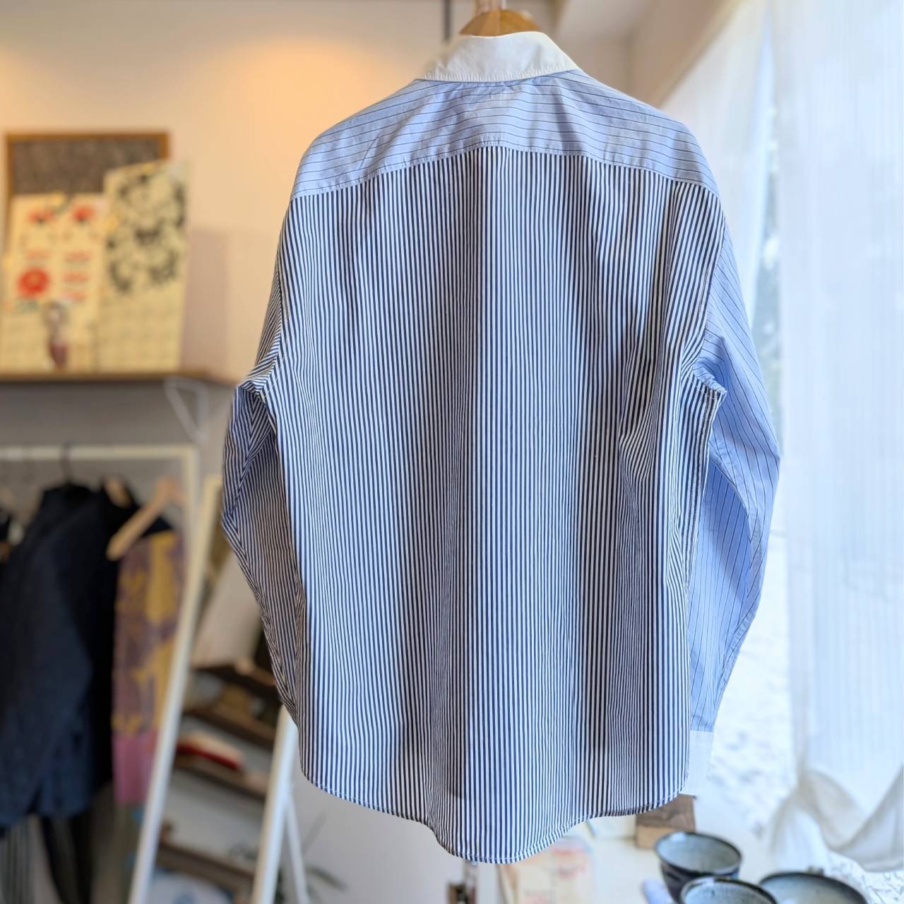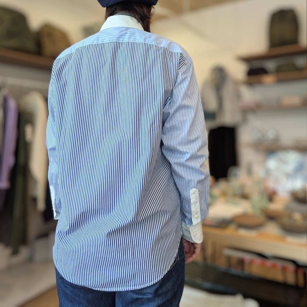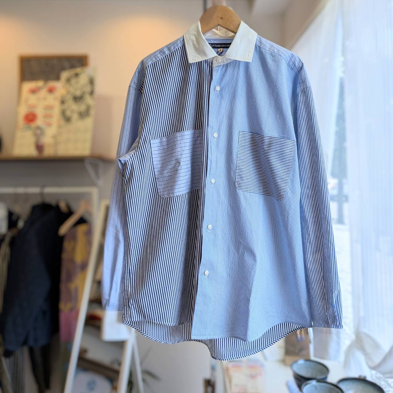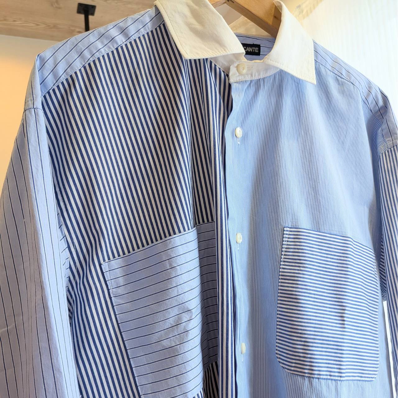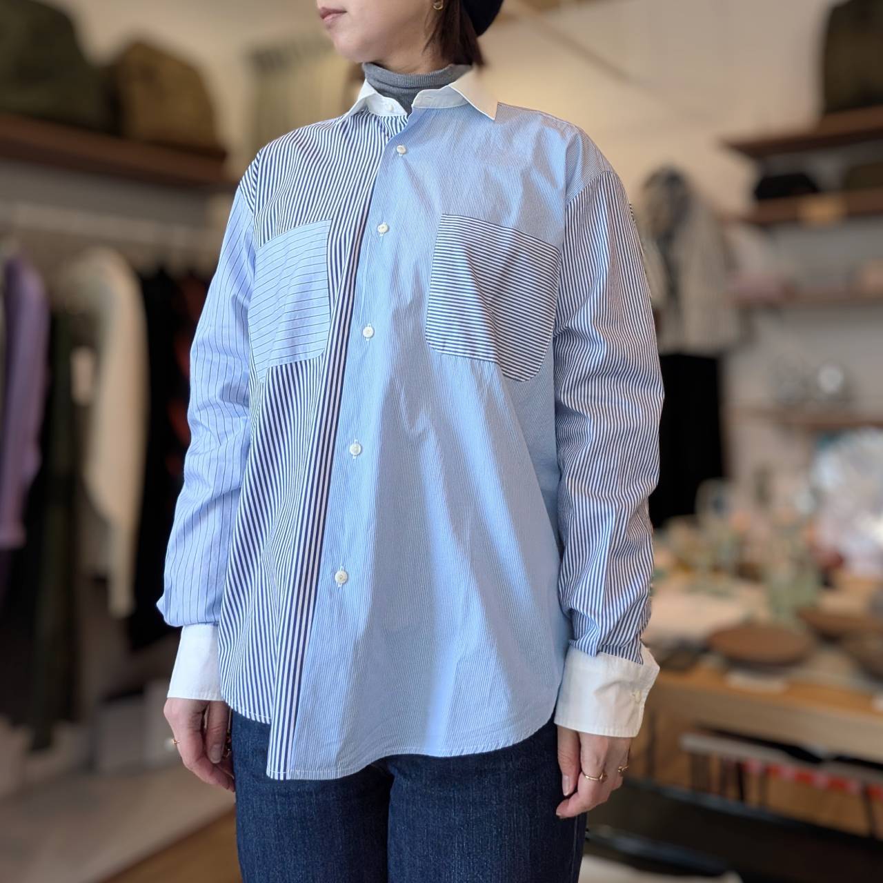 様々なストライプ柄をパッチワークのように仕立てたクレリックシャツ。