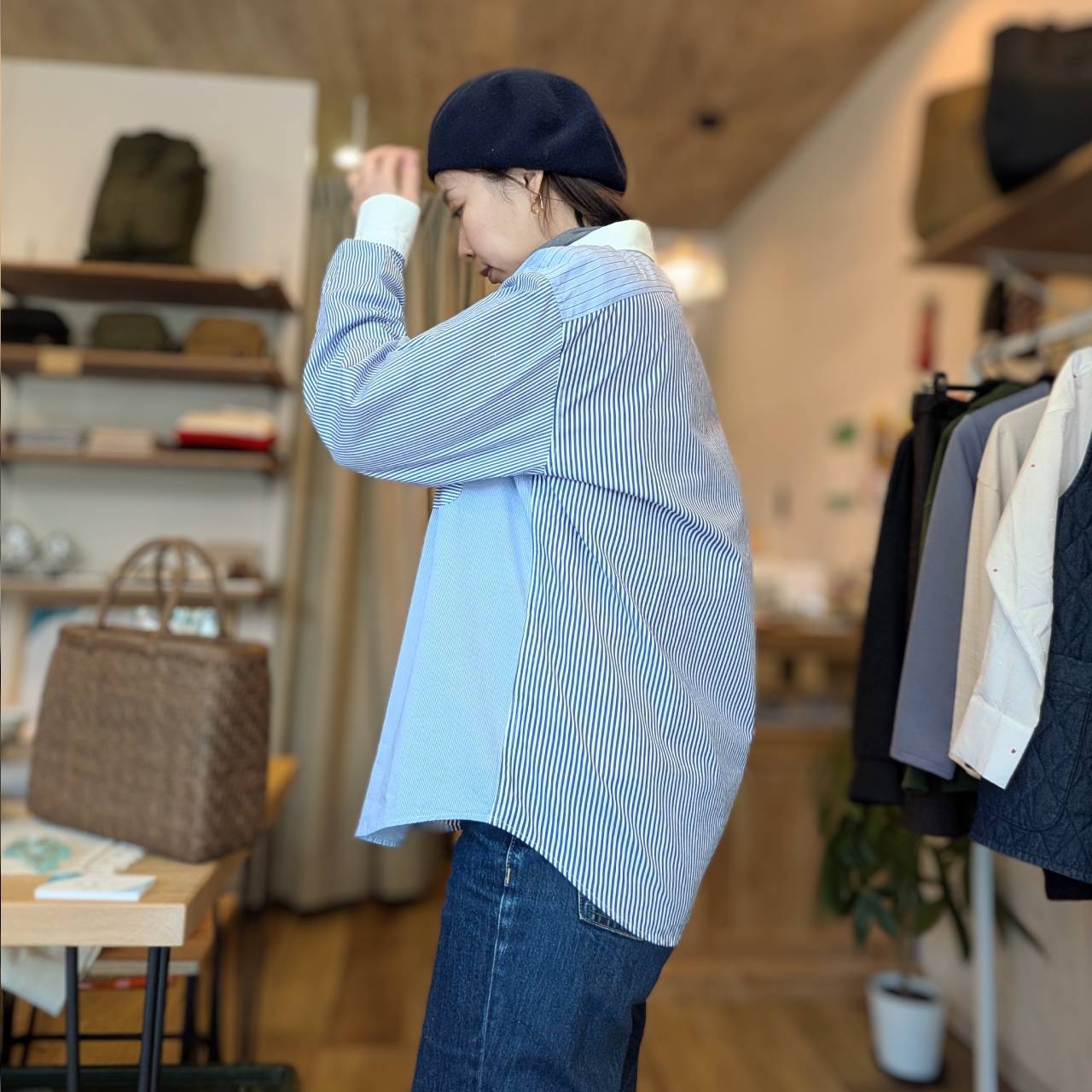 冬はトレーナーやセーターとのレイヤード、春は一枚で、夏は日差しを遮る軽い羽織として、季節を問わず着回しを楽しめる一着です。