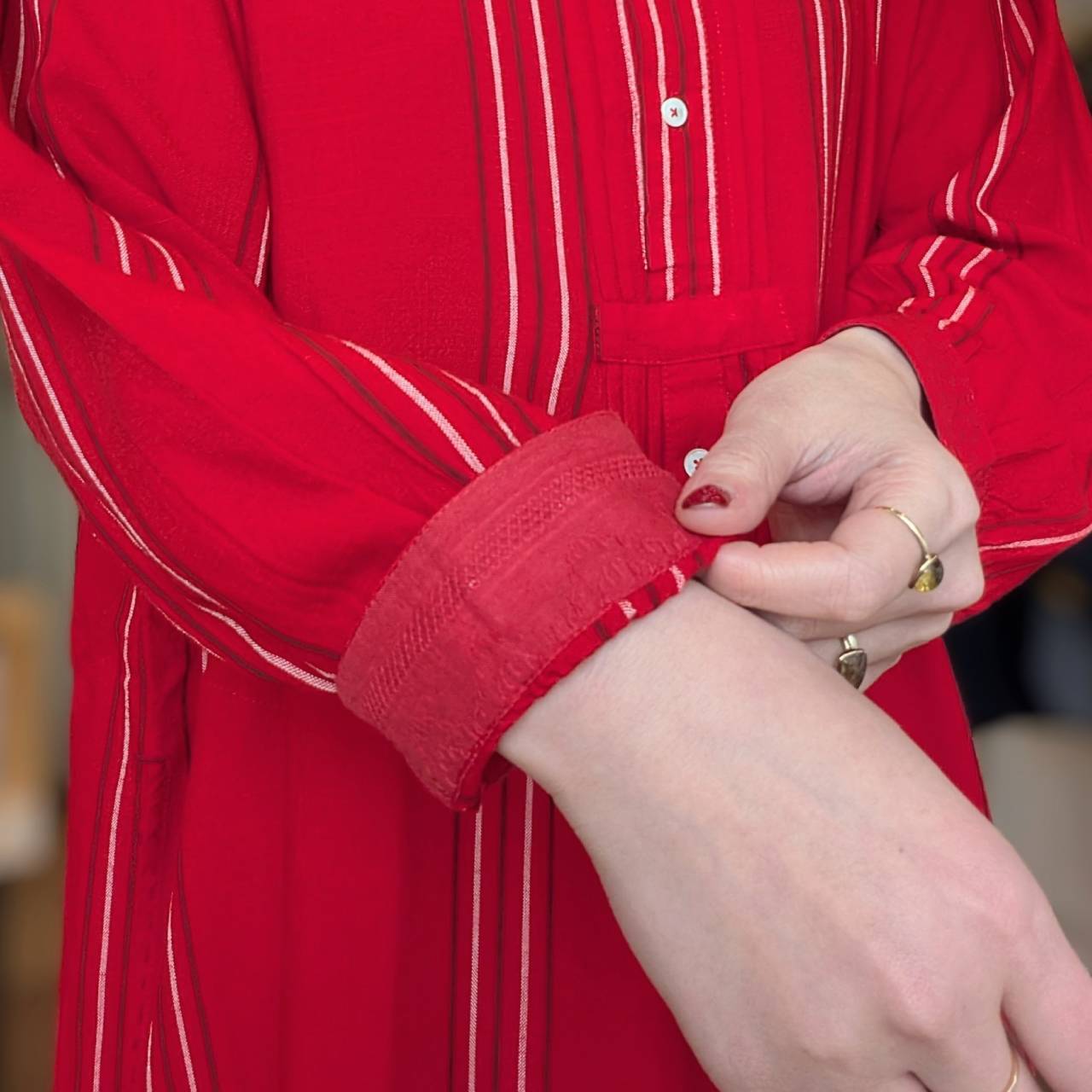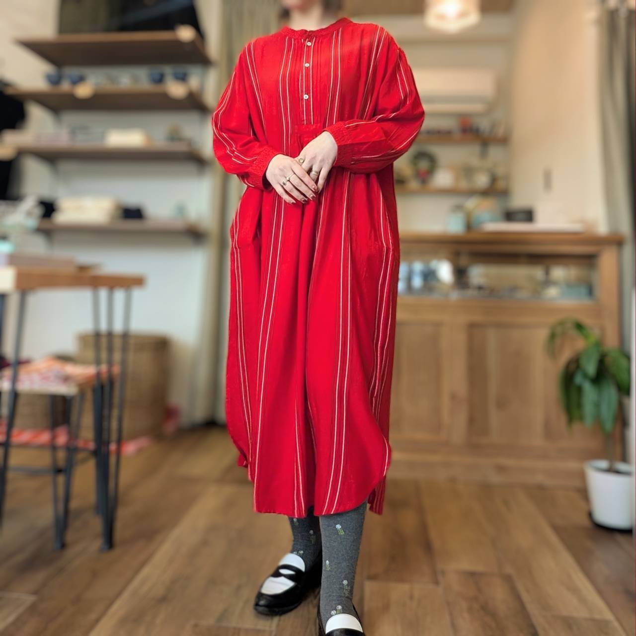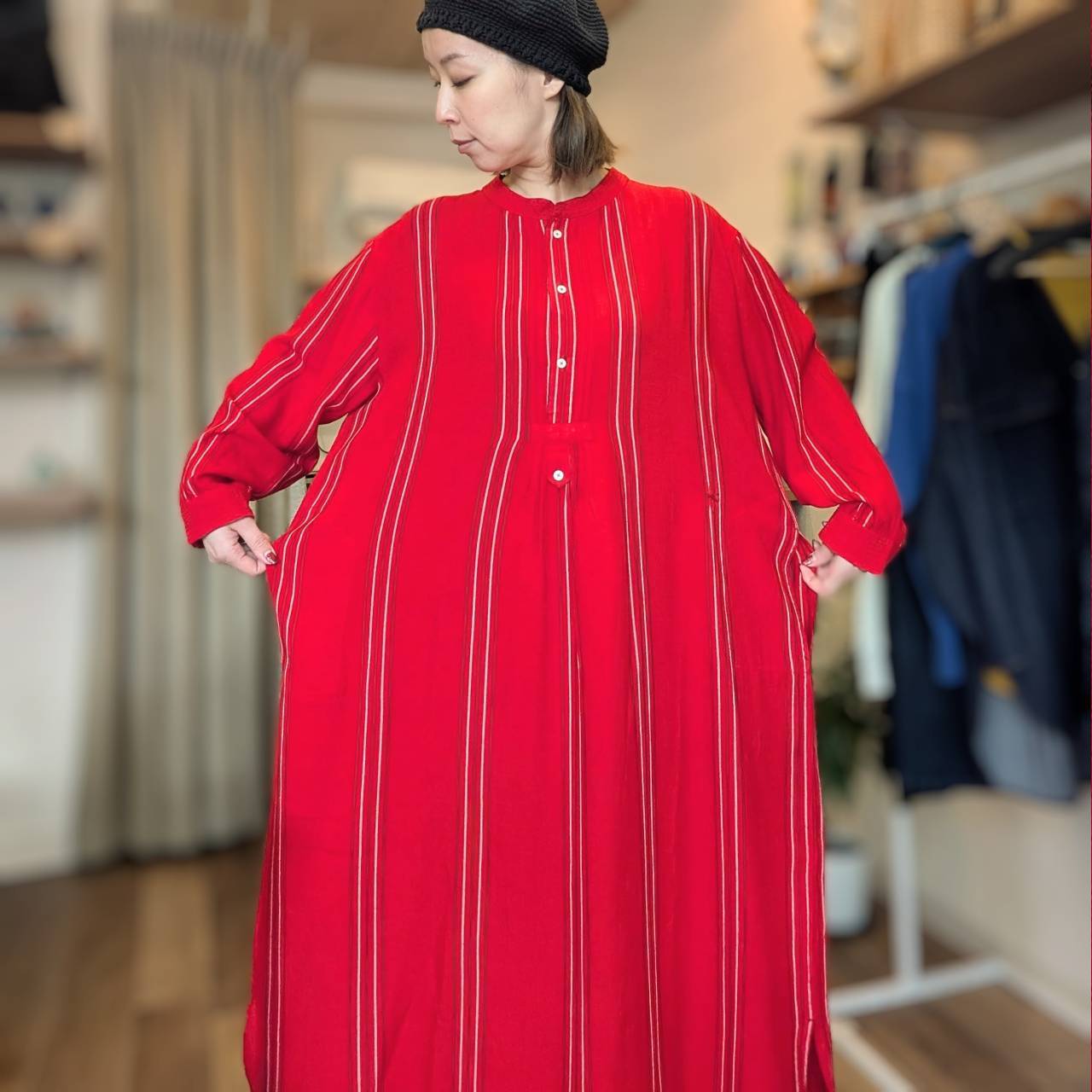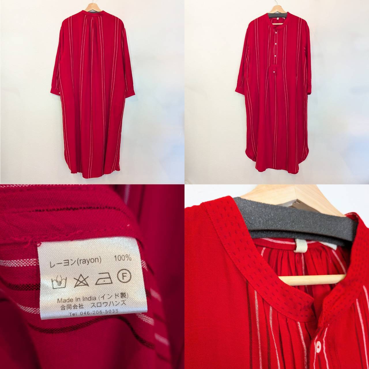鮮やかな赤が目を引く、レーヨン素材のロングワンピース。