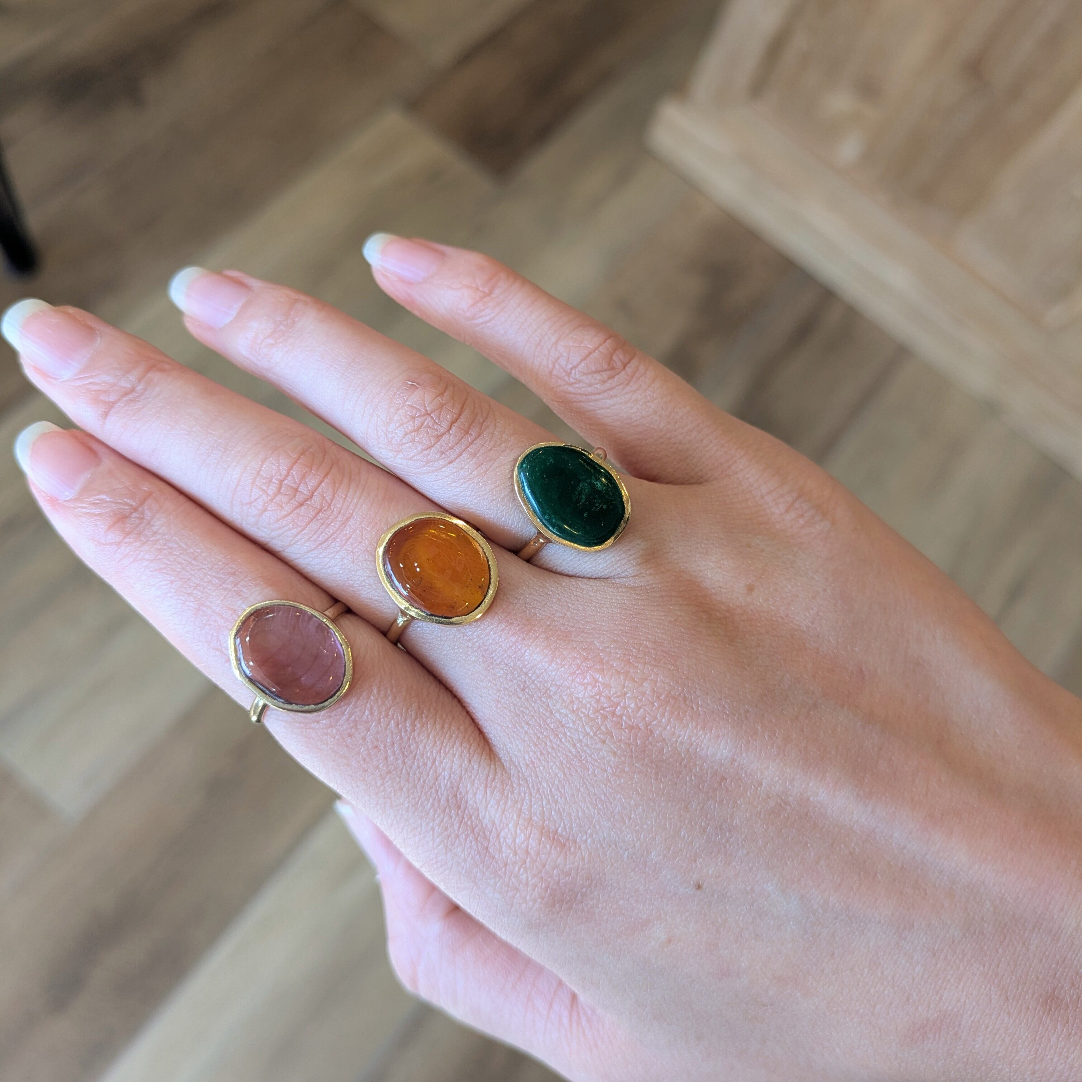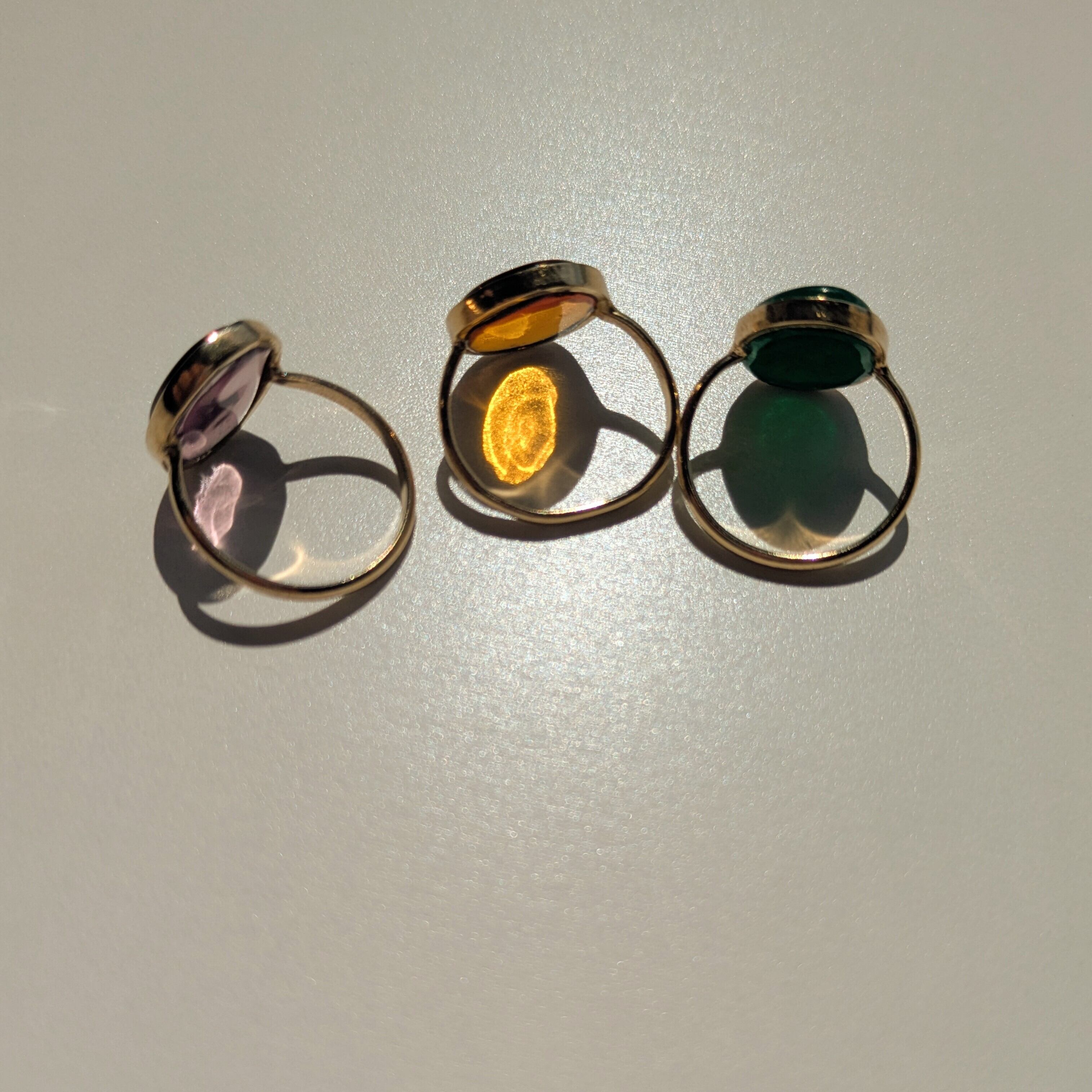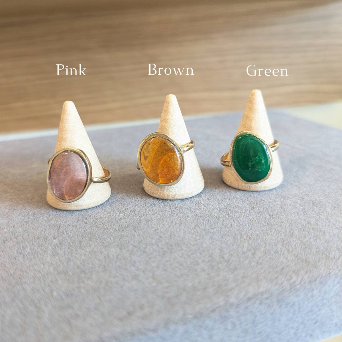 不均等な楕円の形に、透き通るベネチアンガラスを流しこんだ、やや大ぶりのオーバルリング。